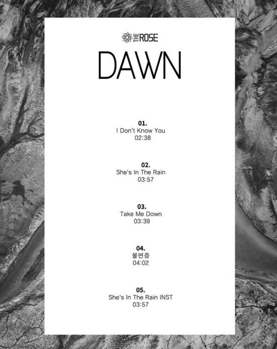 La tracklist officielle du prochain album de The Rose ” intitulé “Dawn” et prévu pour le 4 octobre a été révélée. Le mini-album sera donc composée de 5 chansons, dont une version instrumentale de “She’s In The Rain” :