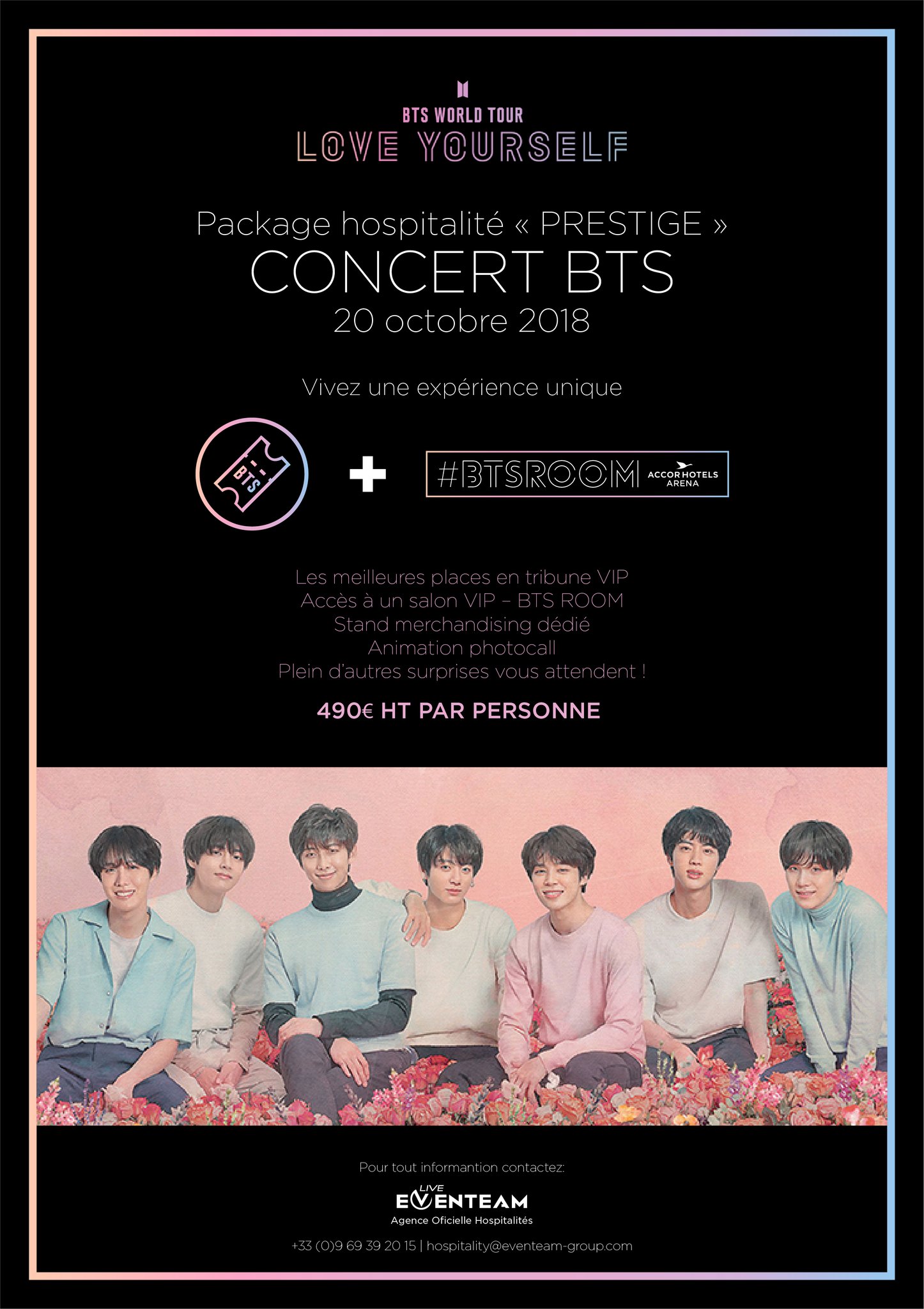 La salle qui accueillera les BTS en octobre prochain pour deux dates de suite, AccorHotels Arena, a annoncé sur ses réseaux sociaux officiels il y a peu que de superbes packages sont mis en vente, un ultime moyen pour vous d’assister au show des garçons. Notez que ces packages prestige, au prix de 490€ l’unité et sans les taxes, sont valables pour la date du 20 octobre. Notez que le montant final s’élève à 606€ avec les taxes. Voici le résumé de ce que vous avez dans ce pack, déjà mis en vente :