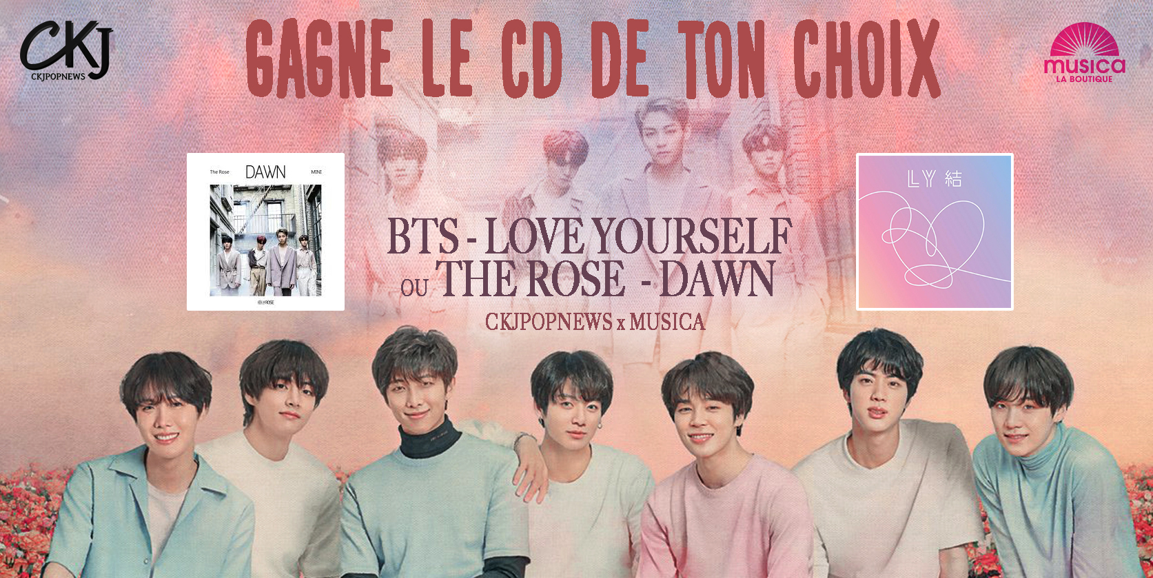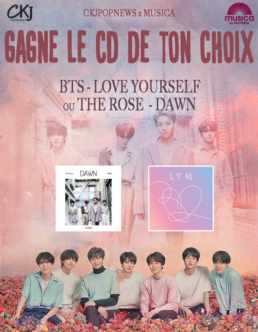 Alors que les groupes masculins BTS et The Rose donneront chacun deux concerts à Paris dans les semaines à venir, vous avez aujourd’hui la possibilité de gagner votre exemplaire de “Love Yourself:Answer“, dernier album repackage des BTS (version aléatoire), ou “Dawn“, le nouveau mini-album de The Rose.