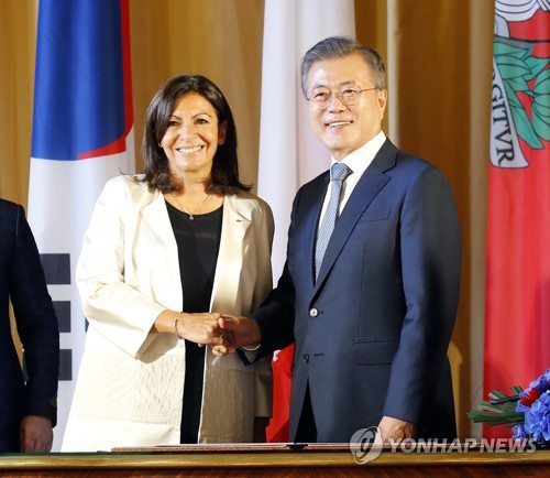 Votre visite d’État c’est aussi une façon pour moi de célébrer, de parler de nos deux capitales, Paris et Séoul, unies par un pacte d’amitié et de coopération il y a 27 ans, pacte que j’ai renouvelé lors de mon dernier déplacement à Séoul aux côtés de Park Won-soon, le maire de Séoul. Je veux vraiment profiter de cette occasion pour vous dire, Monsieur le Président, comme ce voyage m’a marqué et combien il me tarde de revenir à Séoul.