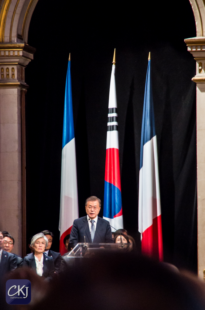 Fort de notre coopération avec la communauté internationale, le peuple coréen et moi-même allons réussir à établir une péninsule pacifique et prospère. La soutien de la ville de Paris, d’où rayonne l’esprit de la révolution, et les Français qui ont su démontrer la grandeur de la France, nous donnera une force irrésistible.