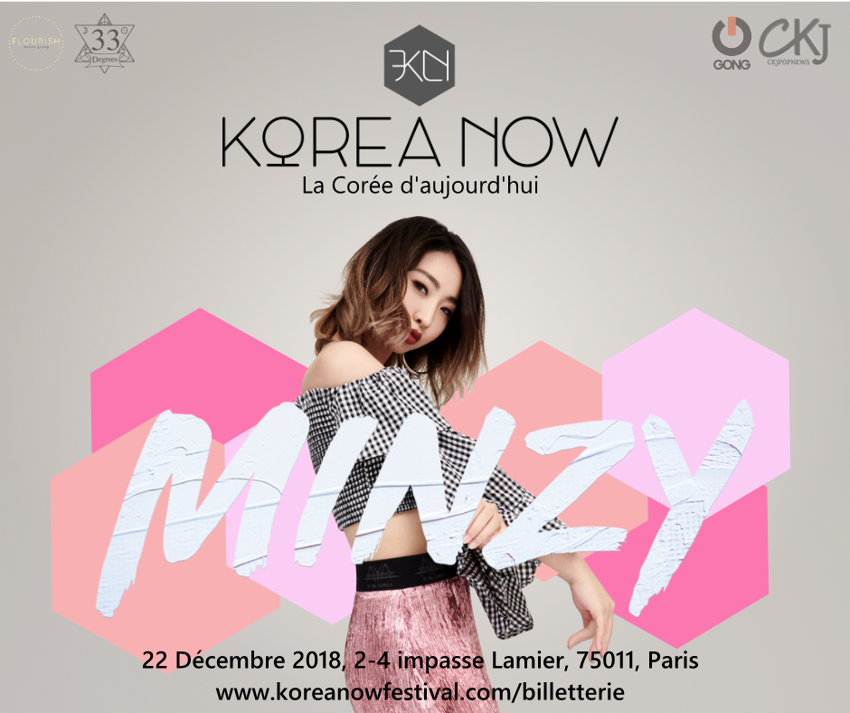 KOREA NOW vient d’annoncer une grande surprise aujourd’hui puisque MINZY, ancienne membre du groupe légendaire de la Kpop 2NE1, sera la guest d’honneur du Festival ! Pour les chanceux qui pourront se procurer une place, elle fera un Fanmeeting le 22 Décembre 2018 entre 12h30 et 15h30. La billetterie du Fanmeeting de MINZY, ouvrira demain à 15h, heure de Paris
