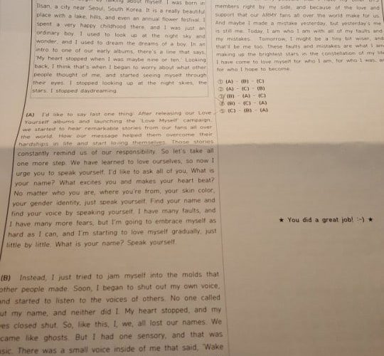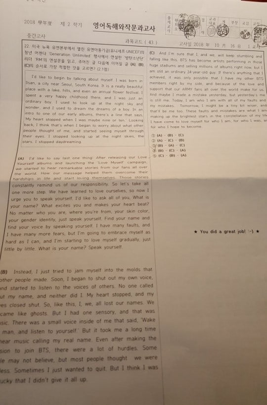 Un des examens d’anglais à mi-parcours dans un lycée coréen demandait aux étudiants de lire le discours de RM et de remettre les paragraphes suivants dans l’ordre :