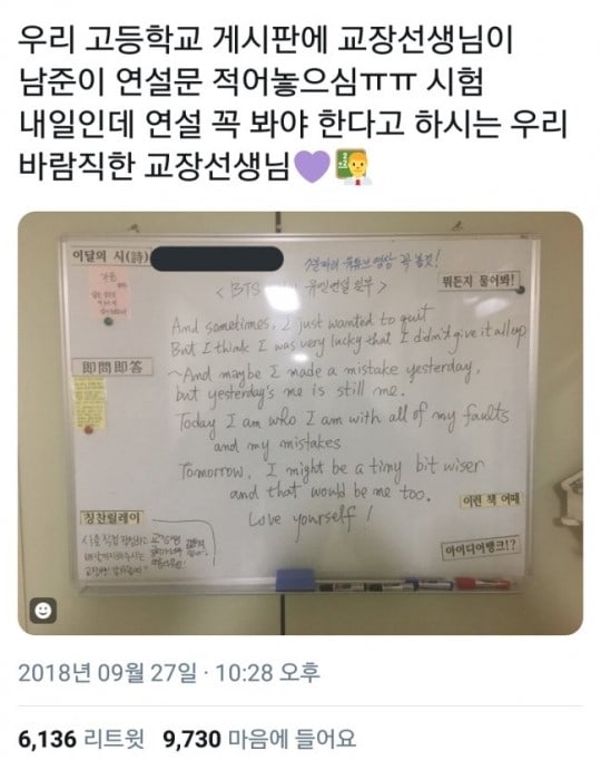 Dans un autre lycée coréen, le proviseur a écrit un extrait du discours sur le tableau principal, en disant qu’il fallait absolument le lire avant les examens du jour d’après.