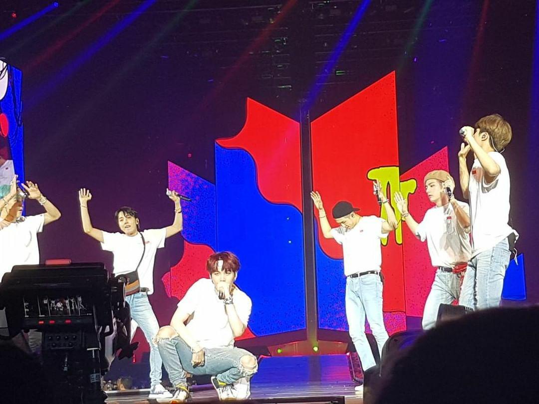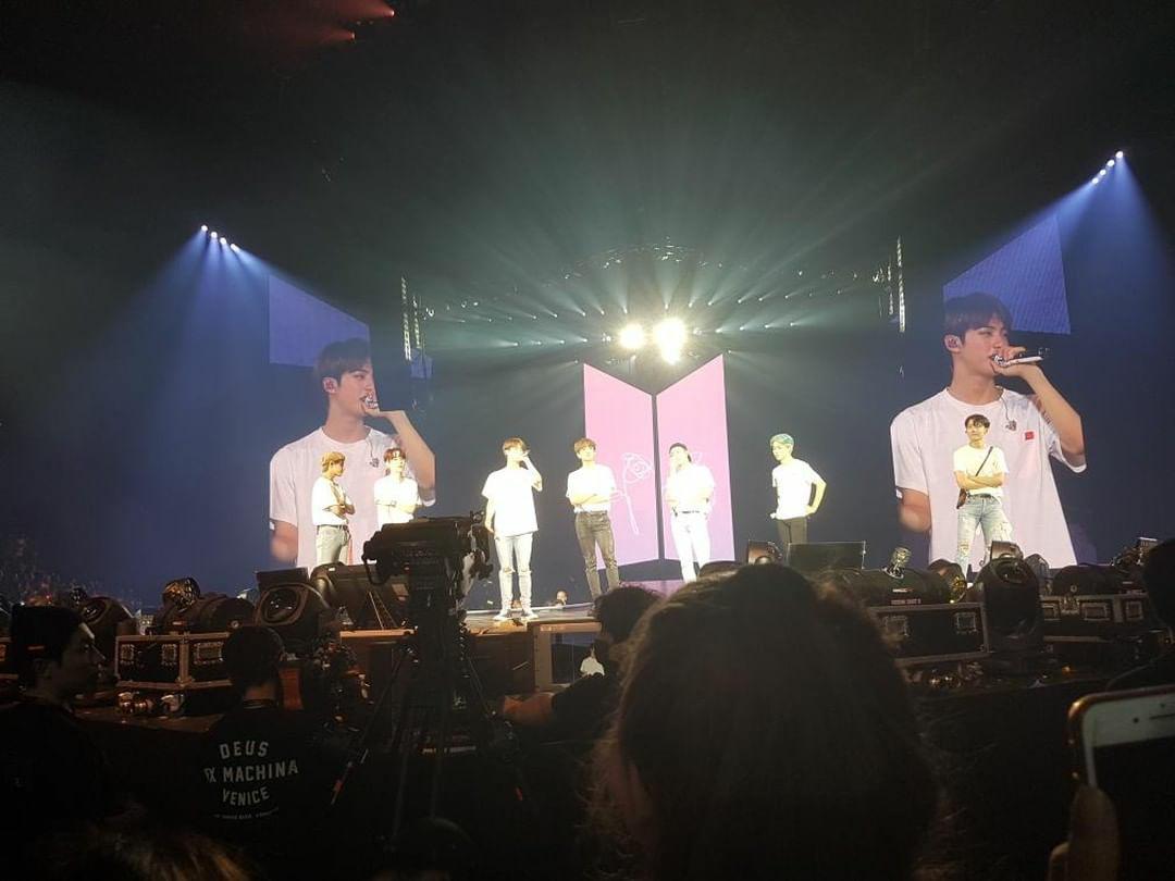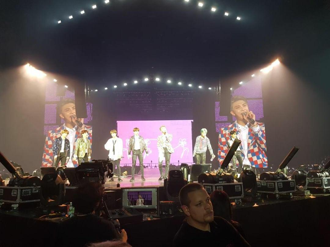 Progressivement, les spectateurs sont donc entrés et la salle diffusait déjà sur les grands écrans les clips “Fake Love“, “Blood, Sweat & Tears“, “DNA” mais aussi des clips plus anciens, comme “Danger“, “No more Dream” ou encore “Just One Day“. L’ambiance montait et les cris fusaient à chaque fois que l’un des garçons apparaissait à l’écran. Des publicités étaient diffusées afin de pouvoir régler les derniers soucis techniques de l’Army Bomb, et les fans chantaient en cœur avant même le début du concert.