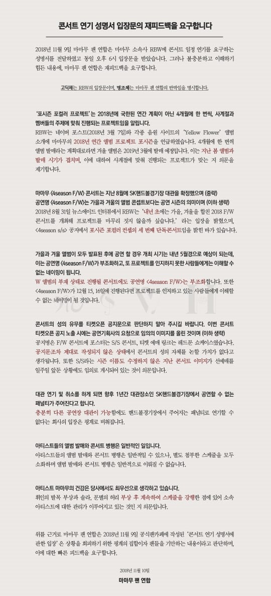 Le 10 novembre, le fandom des MAMAMOO a sorti un nouveau communiqué sur lequel on peut lire :