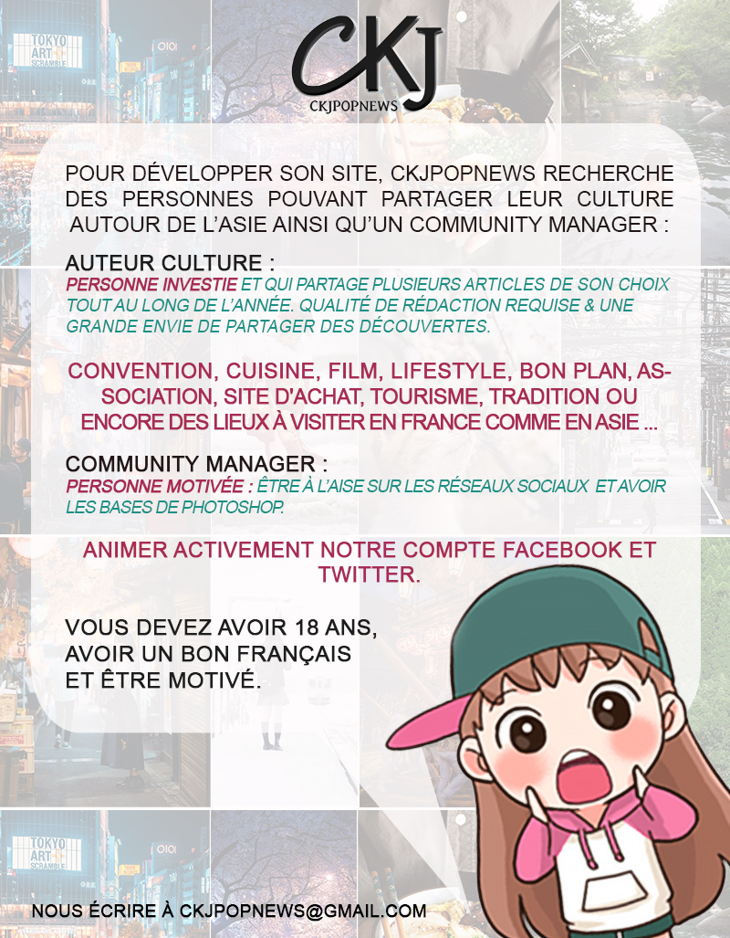 Pour développer son site, CKJPOPNEWS recherche des personnes pouvant partager leur culture autour de l’Asie ainsi qu’un community manager !