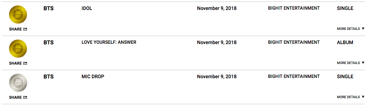 “Love Yourself : Answer” est le premier album d’un artiste coréen à être certifié d’or, tandis qu”IDOL” est le quatrième single des BTS à recevoir cette certification, après “MIC Drop”, “DNA” et “Fake Love”.