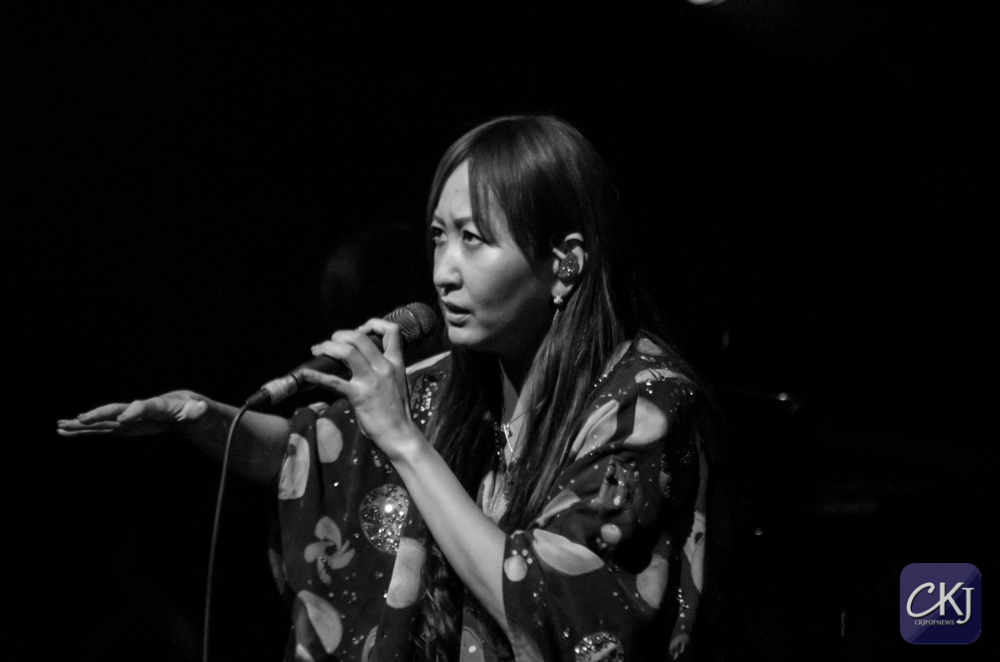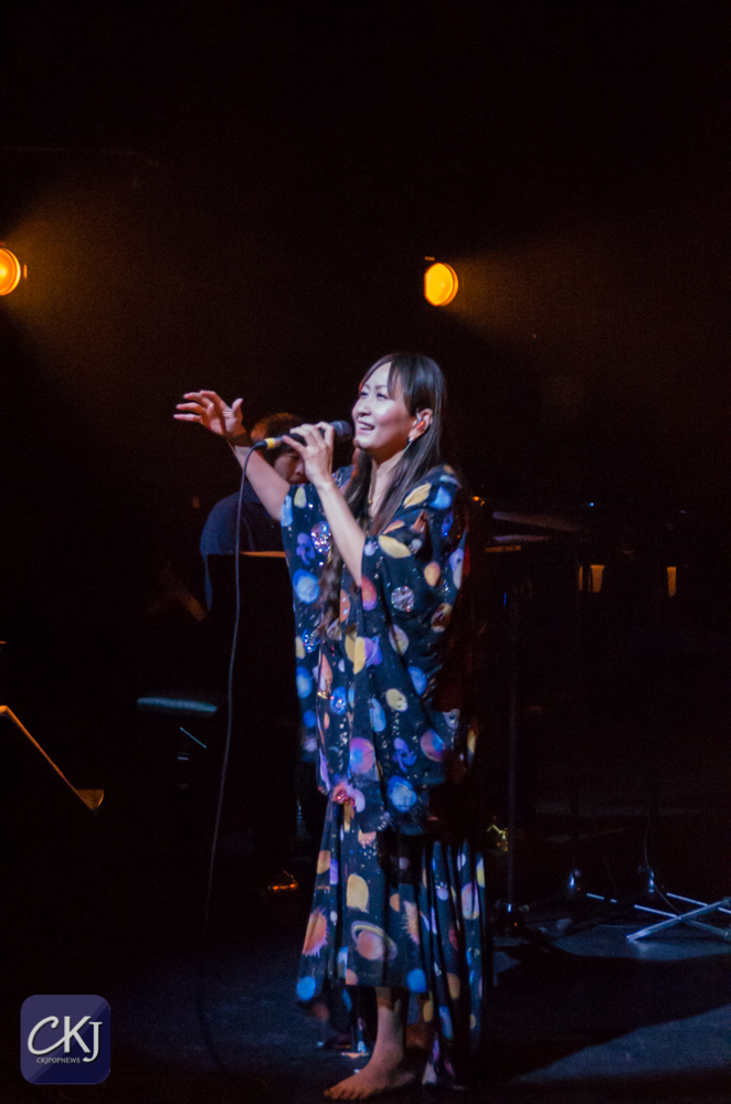 Place à une intro au piano qui a donné la tonalité des émotions de la chanson “Fukurou ~Fukurou ga shiraseru kyaku ga kita to~”. Dès le début, nous avons été englouti dans cette espèce d’océan d’émotions. Entre chant de hibou et chant de baleine, KOKIA a envoûté son public par l’océan de couleurs et d’images qu’elle a dessiné par sa voix. La deuxième partie de la chanson a changé de ton, et est devenue un chant un peu plus mystérieux, plus nuancé. La chanteuse a véritablement fait appel aux sens, et à une sensibilité toute autre. Elle a alors conté son histoire dans un calme olympien.