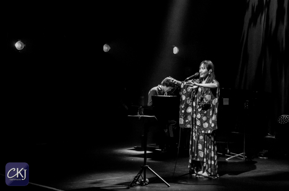 La chanson suivante, moins connue du public, intitulée “Kasa wo kashite agete“, a été un sublime dialogue piano-voix qui a complètement effleuré le public. KOKIA a incarné un véritable poète et a tissé elle-même les notes de cette chanson. Sa complicité avec les musiciens a été complètement sublimée lors de cette performance.