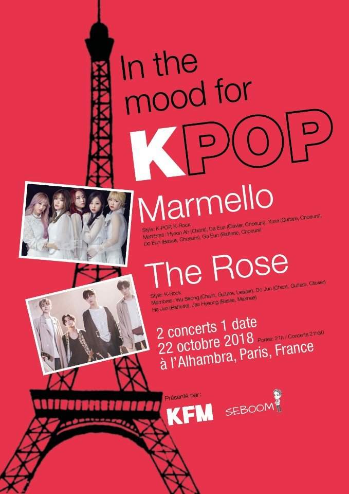 Le 22 octobre 2018 s’est déroulé dans la salle de l’Alhambra un concert exceptionnel en France avec deux groupes de rock féminin et masculin, Marmello et The Rose ! Ce concert, né du projet de Seboom, K-FM et les artistes, a été l’occasion de connaître une organisation toute autre de ce à quoi nous sommes habitués dans l’Hexagone et d’apprécier la musique de ces groupes pour le moins très talentueux.