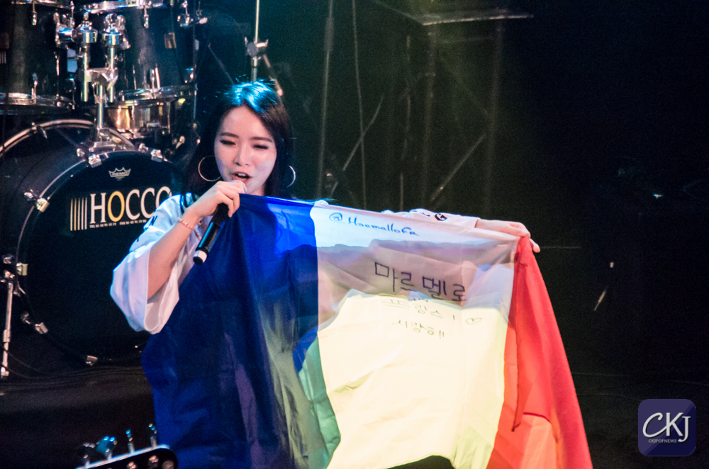 “Vu que nous sommes en France, nous avons préparé quelque chose de spécial. À la base, quand on fait des concerts, Gaeun ne parle pas beaucoup, mais maintenant, elle va s’exprimer.”
