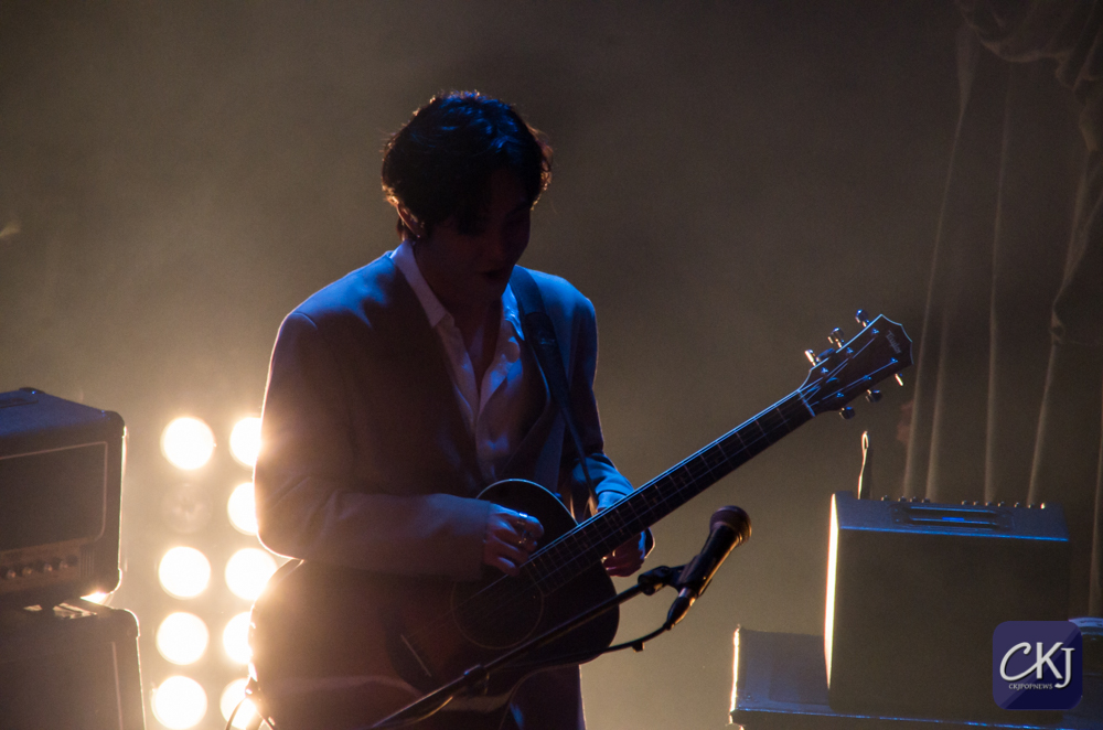 Malheureusement, la bonne ambiance a été interrompue par quelques malaises qui se sont enchaînés dans la fosse, et qui ont amené les musiciens à faire une pause assez longue. Pendant ce temps, les organisateurs ont su gérer la situation avec discernement et sont donc descendus donner des bouteilles d’eau, pendant que les quelques personnes qui ont été victimes de crises d’asthme et de malaises étaient prises en charge par la sécurité et les autres équipes. C’est Woosung lui-même qui a interrompu le concert lorsqu’il a repéré le premier malaise. Il a ensuite demandé aux fans de prendre le plus d’espace possible dans cette fosse bondée afin de respirer, de ne pas écraser les autres en s’avançant et d’essayer de s’hydrater, et de demander de l’aide si jamais ça n’allait pas. Les musiciens ont alors donné leurs bouteilles d’eau aux fans et ont tenté de calmer les foules et de reprendre en main le concert face à cet imprévu, loin d’être sympathique.