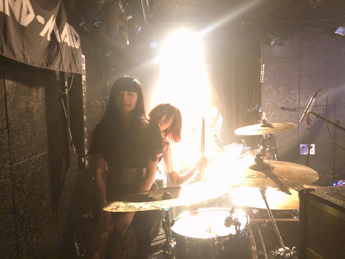 C’est en nage qu’elles ont continué avec “Carry On Living“, issu de leur dernier album “World Domination”. Le rythme n’a pas eu un instant pour ralentir et l’ambiance n’a pu que s’en échauffer davantage. Déjà les baguettes de batterie claquaient entre elles et Kanami reprenait de plus belle sur sa guitare électrique. “Carry On Living” a des sons plus sombres et violents que les précédentes chansons, sentiments que Saiki a su faire partager avec puissance. Mais c’est surtout une chanson pleine de force, d’une force poignante que les musiciennes ont exprimé en donnant tout ce qu’elles avaient, pour finalement poursuivre sur un titre en rien plus joyeux puisqu’il s’intitule “Alone“.