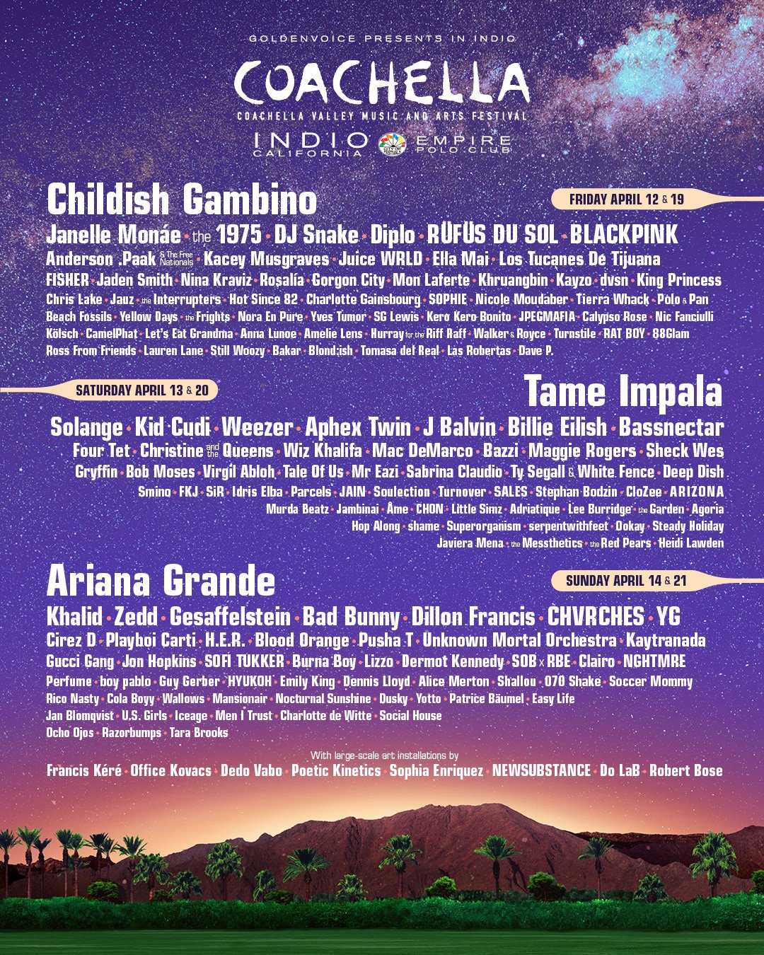 Les festivaliers pourront retrouver de la K-Pop dans l’édition de cette année. BLACKPINK performera le 12 et 19 avril tandis que HYUKOH sera présent le 14 et 21 avril. Un troisième groupe coréen Jambinai sera également sur scène le 13 et 20 avril. Retrouvez le programme complet :