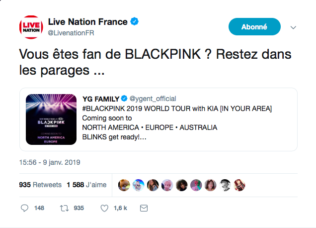 Même si aucun pays n’est confirmé pour le moment, la France a de bonnes chances de se retrouver dans la liste des pays sélectionnés pour cette tournée, puisque Live Nation France a partagé le post de la tournée sur son compte Twitter officiel, en conseillant aux Blinks français de restez à l’affût des prochaines annonces :