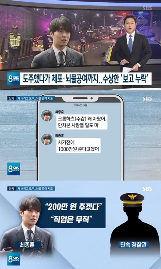 La SBS s’est adressé à plusieurs sources au sein des forces de police pour comprendre les détails de l’affaire. Selon son rapport, en février 2016, Choi Jong Hoon conduisait sous l’emprise de l’alcool avant d’être arrêté par un véhicule de police, après avoir tenté de faire demi-tour. Lorsque l’officier de police lui a demandé de se soumettre à un éthylotest, il aurait abandonné la voiture et fuit, en vain, puisque l’officier lui a passé les menottes autour des poignets. Choi Jong Hoon aurait menti sur son identité en déclarant qu’il était sans emploi et aurait offert un pot de vin de 2 millions de wons à l’agent.
