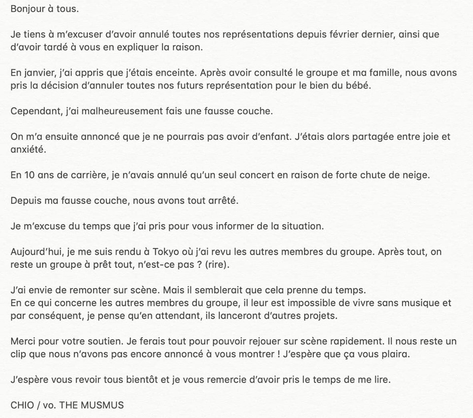 Le 15 mai, le groupe THE MUSMUS a partagé une information très importante à ses fans. La chanteuse CHIO a dévoilé via le site web et les réseaux sociaux du groupe qu’elle avait malheureusement fait une fausse couche et a donc révélé que ce tragique évènement dans sa vie expliquait le manque d’activités du groupe.