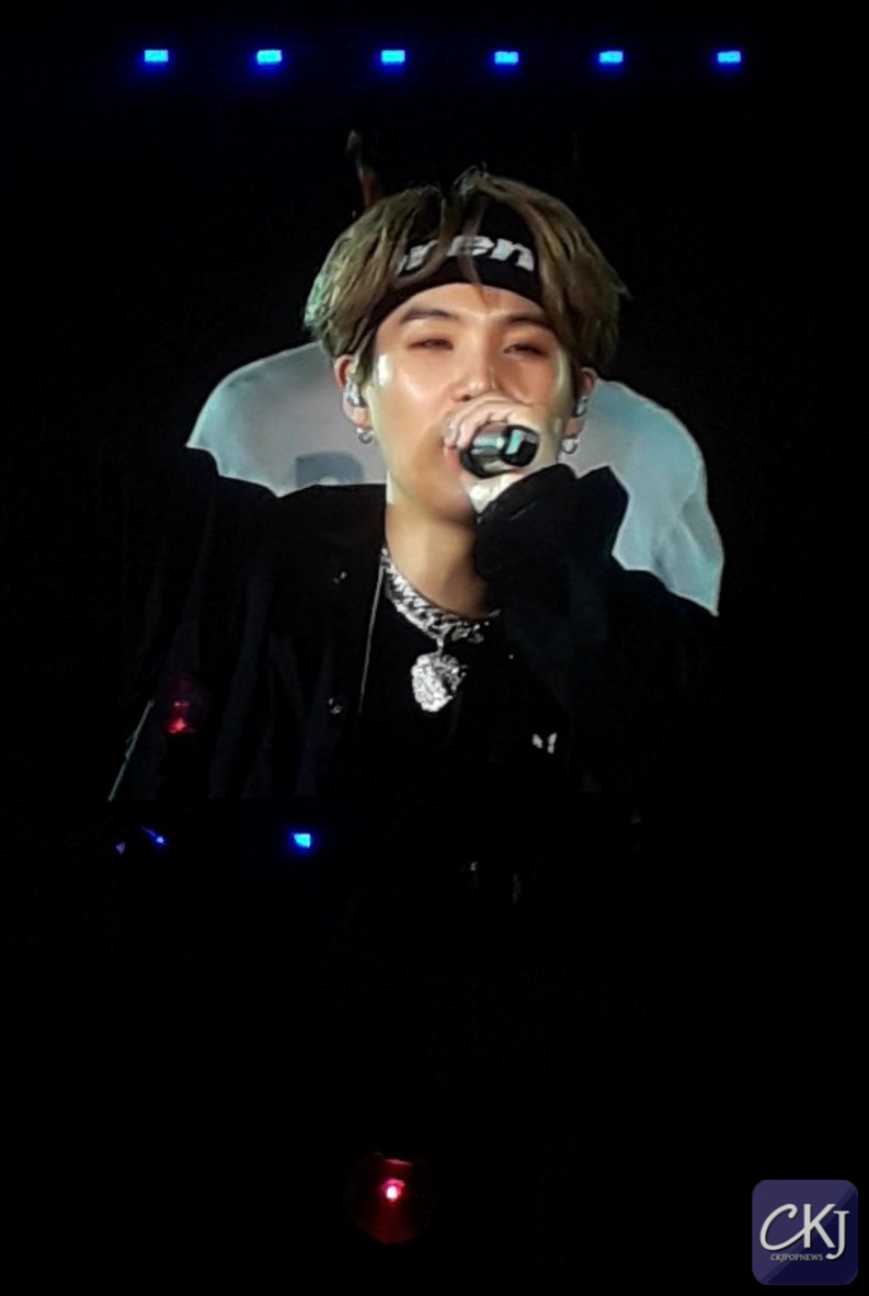 Après des VCR dont on se passerait bien, Suga prend place sur le titre “Seesaw”. L’artiste dégage un charisme naturel, mais ne fournit pas pour autant sa meilleure performance. Alors que son talent ne peut être nié, on reste un peu sur notre faim, même si il n’est pas déplaisant de voir que le rappeur chante aussi pour lui. On aurait tout de même apprécier d’en voir plus, étant donné le potentiel du titre. Jin, quant à lui, s’improvise aussi musicien le temps d’un instant. Avec son fameux micro rose pailleté, Jin nous ravit avec une performance épurée et profondément honnête. Sur une scénographie qui rappelle les séquences du clip d’“Epiphany”, les fans et le chanteur se laissent bercer par le message de la chanson, surtout sur les notes de fin. A certains moments, la musique s’efface pour laisser place à un silence -enfin, de ce qui peut se faire dans un tel concert- et l’on savoure alors l’arrangement musical.