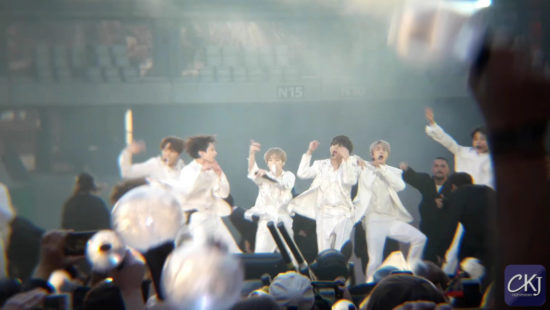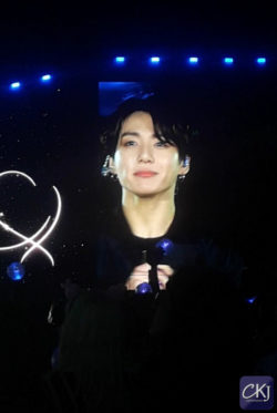 C’est au tour de Jungkook, habitué des tournées depuis son plus jeune âge, de prendre la parole, avec une maturité déconcertante, avant d’être interrompu par les chants des fans :