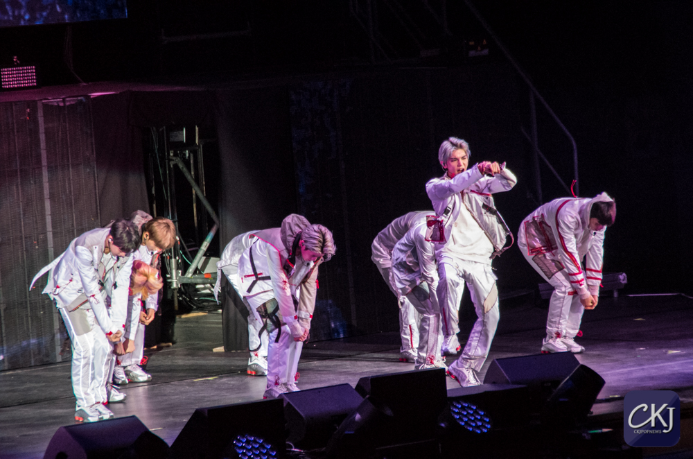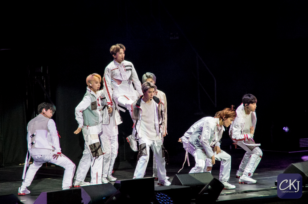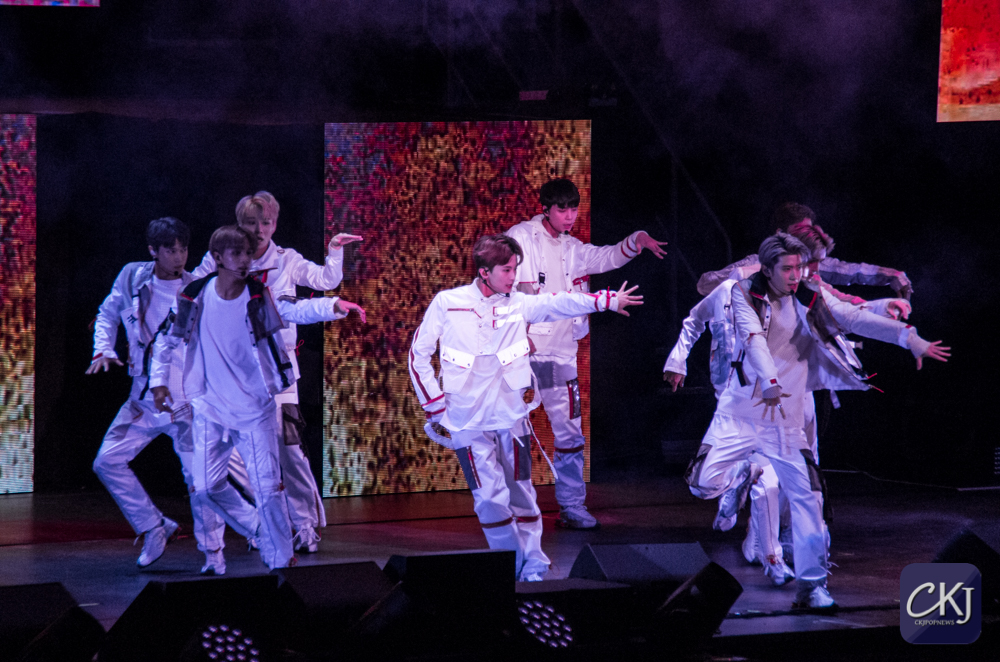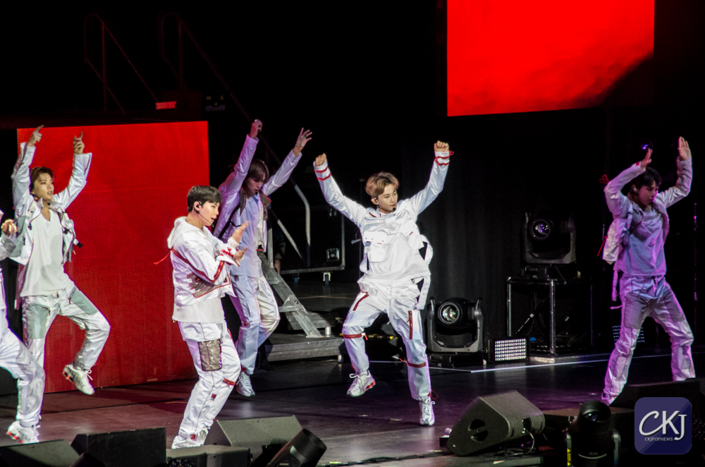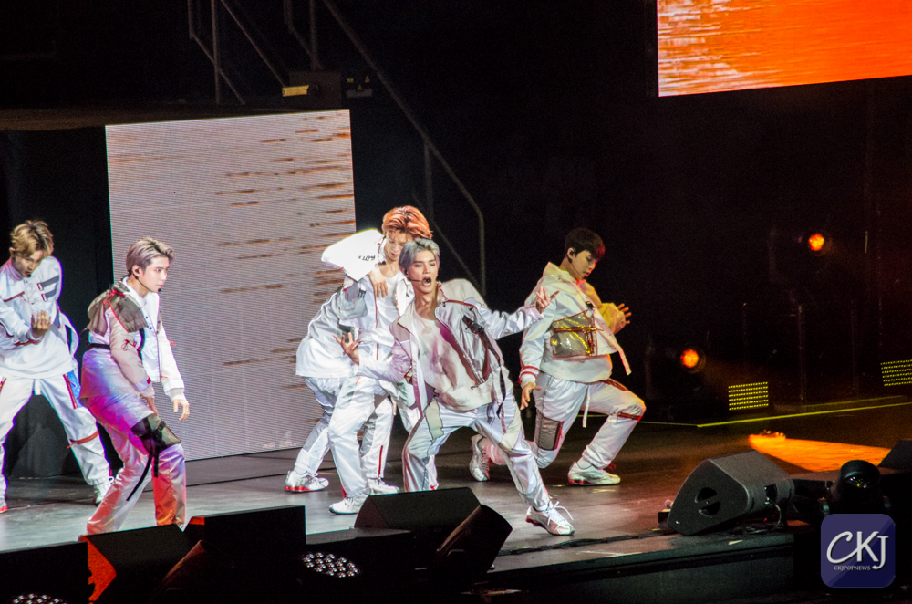 Lorsque les NCT 127 sont arrivés sur scène pour le tout premier morceau, “Cherry Bomb“, dans des tenues blanches, la température est encore montée d’un cran ! Les flammes ont réchauffé la salle, déjà en ébullition et les NCT 127 ont livré une performance époustouflante sur une de leurs chorégraphies les plus populaires. La machine NCT était alors lancée, et la puissance avec laquelle ils ont effectué les mouvements était remarquable. Nul doute, le groupe de la SM a reçu une formation impeccable et a répondu à la folie NCT avec un grand entrain. Pour dire à quel point le groupe n’a pas fait l’impasse sur l’énergie, les gouttes de sueur coulaient à flots le long de leurs tempes dès les premiers instants du show.