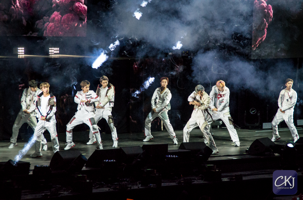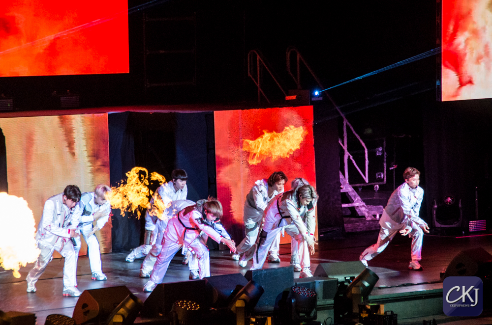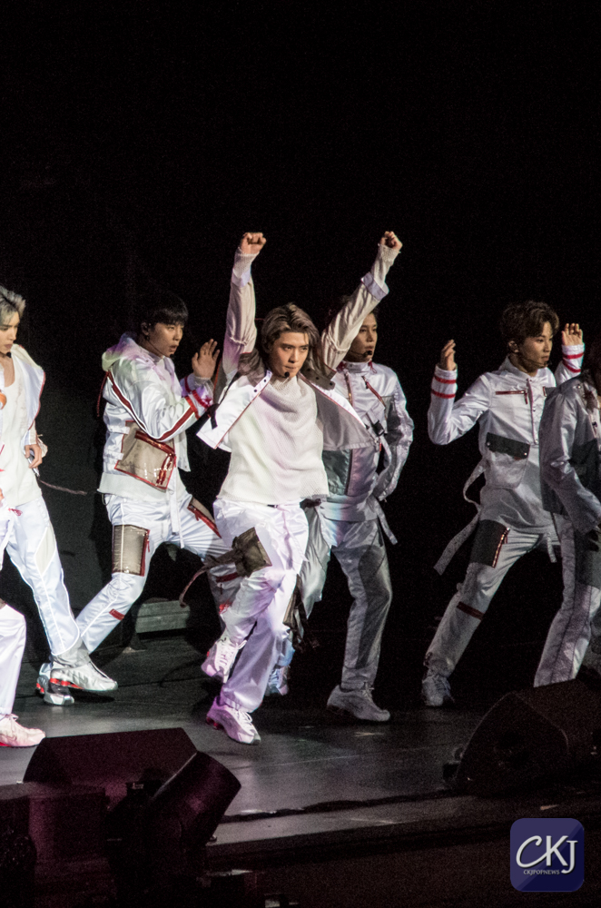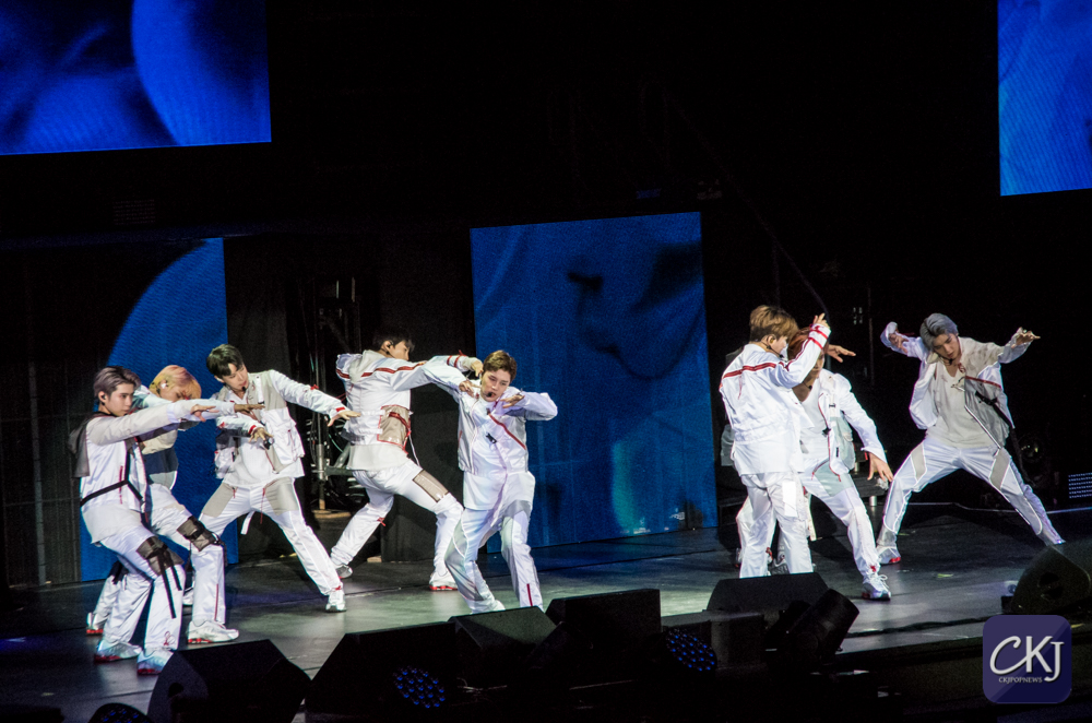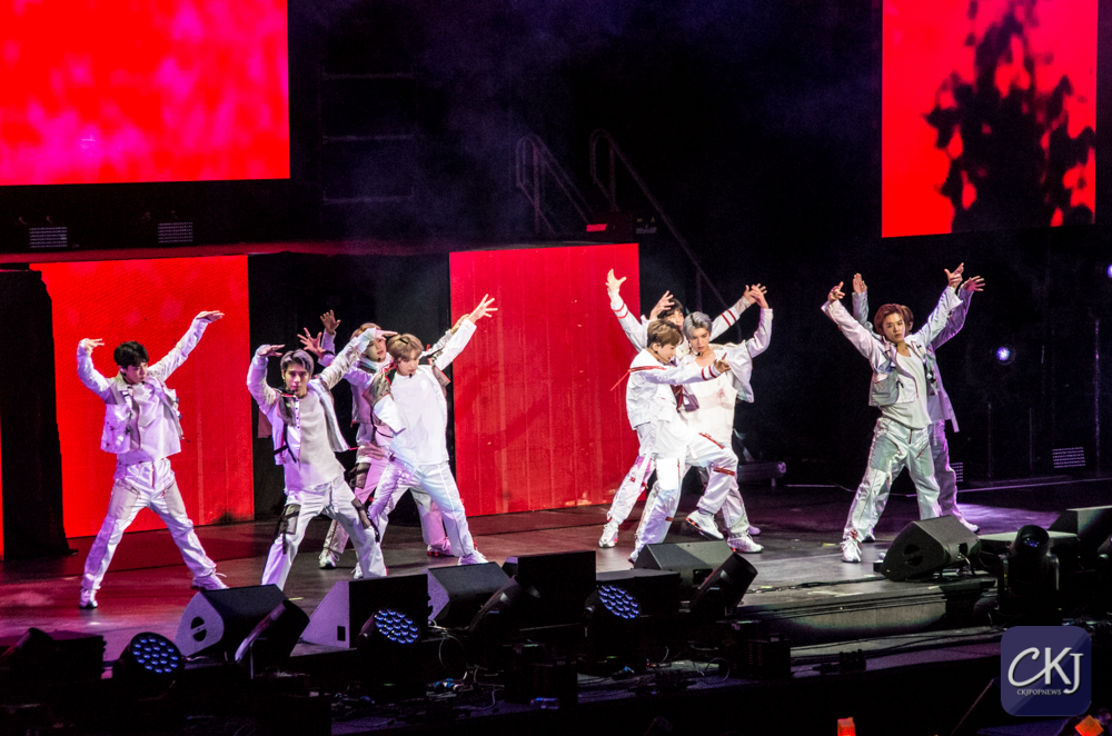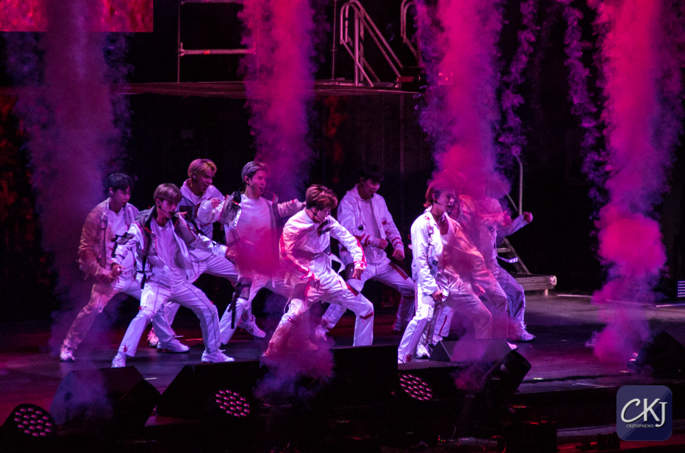 Lorsque les NCT 127 sont arrivés sur scène pour le tout premier morceau, “Cherry Bomb“, dans des tenues blanches, la température est encore montée d’un cran ! Les flammes ont réchauffé la salle, déjà en ébullition et les NCT 127 ont livré une performance époustouflante sur une de leurs chorégraphies les plus populaires. La machine NCT était alors lancée, et la puissance avec laquelle ils ont effectué les mouvements était remarquable. Nul doute, le groupe de la SM a reçu une formation impeccable et a répondu à la folie NCT avec un grand entrain. Pour dire à quel point le groupe n’a pas fait l’impasse sur l’énergie, les gouttes de sueur coulaient à flots le long de leurs tempes dès les premiers instants du show.