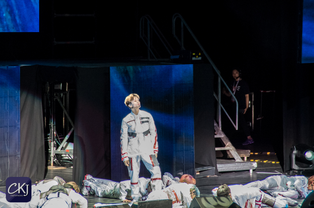 Pour l’occasion, les fans se sont apprêtés de leurs plus beaux habits vert et jaune fluorescents ! Le concert a commencé sous des cris et un vrombissement des enceintes qui promettait déjà d’envoyer. Sur fond de musique épique, la vidéo d’introduction des membres a bien donné le ton à la soirée. Le concept de différentes sphères temporelles a été exploité à son maximum :