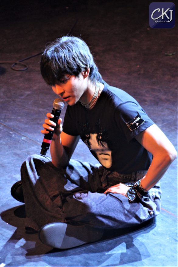 Il se sera fait attendre. Après un set de DJ d’environ une demi-heure conçu tout spécialement pour les nostalgiques des sons 2010s et des tubes de l’été, et après la prestation d’un Tiktokeur, Woosung débarque sur scène aux alentours de 21h, dans une tenue très 70s. Face et Lazy pour commencer, deux titres phares du chanteur à la voix d’or. Avec des mouvements de danse aussi fluides, Woosung s’empare de la scène avec aisance, et l’irradie de sa seule présence. Le plaisir de retrouver ses fans, le joli brun, un brin taquin, vient provoquer celleux du premier rang. Effleurements de mains, clins d’œil et sourires pour revêtir la parfaite panoplie de l’idole funky des 80s. Ces interactions avec le public auront rythmé la soirée, dans un subtil équilibre entre fan-service et dévotion totale pour ses fans.