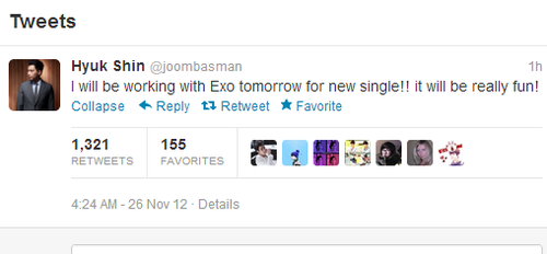 Je m’emballe peut-être pour un rien et je n’ai pas beaucoup d’informations sur le sujet, mais sur le net depuis environs deux mos, la rumeur d’un comeback pour les EXO en novembre fait rage chez les fans du groupe les “Exotic” et sur tout les réseaux sociaux. Alors que beaucoup commençait à baisser les bras en faisant le décompte des jours de novembre un tweet de Hyuk Shin @joombasman vient de faire renaître tous les espoirs des fans. Voici le tweet en question !