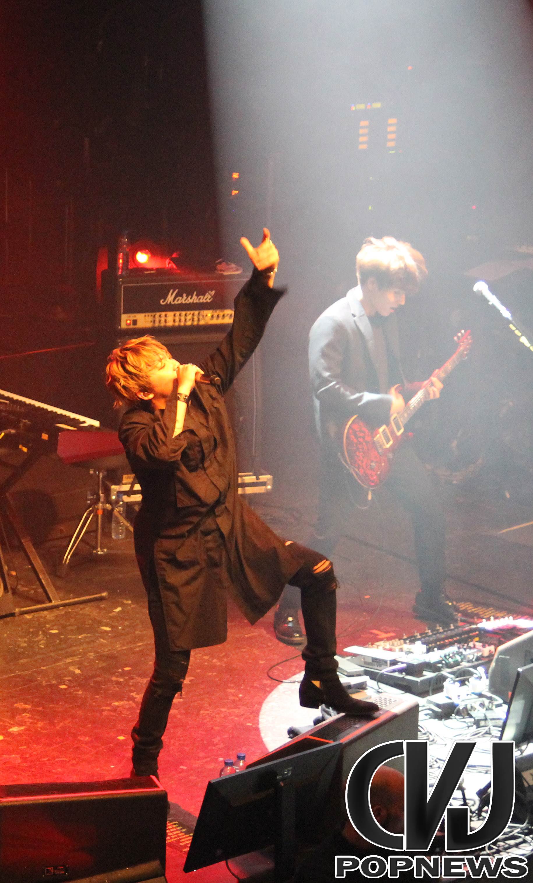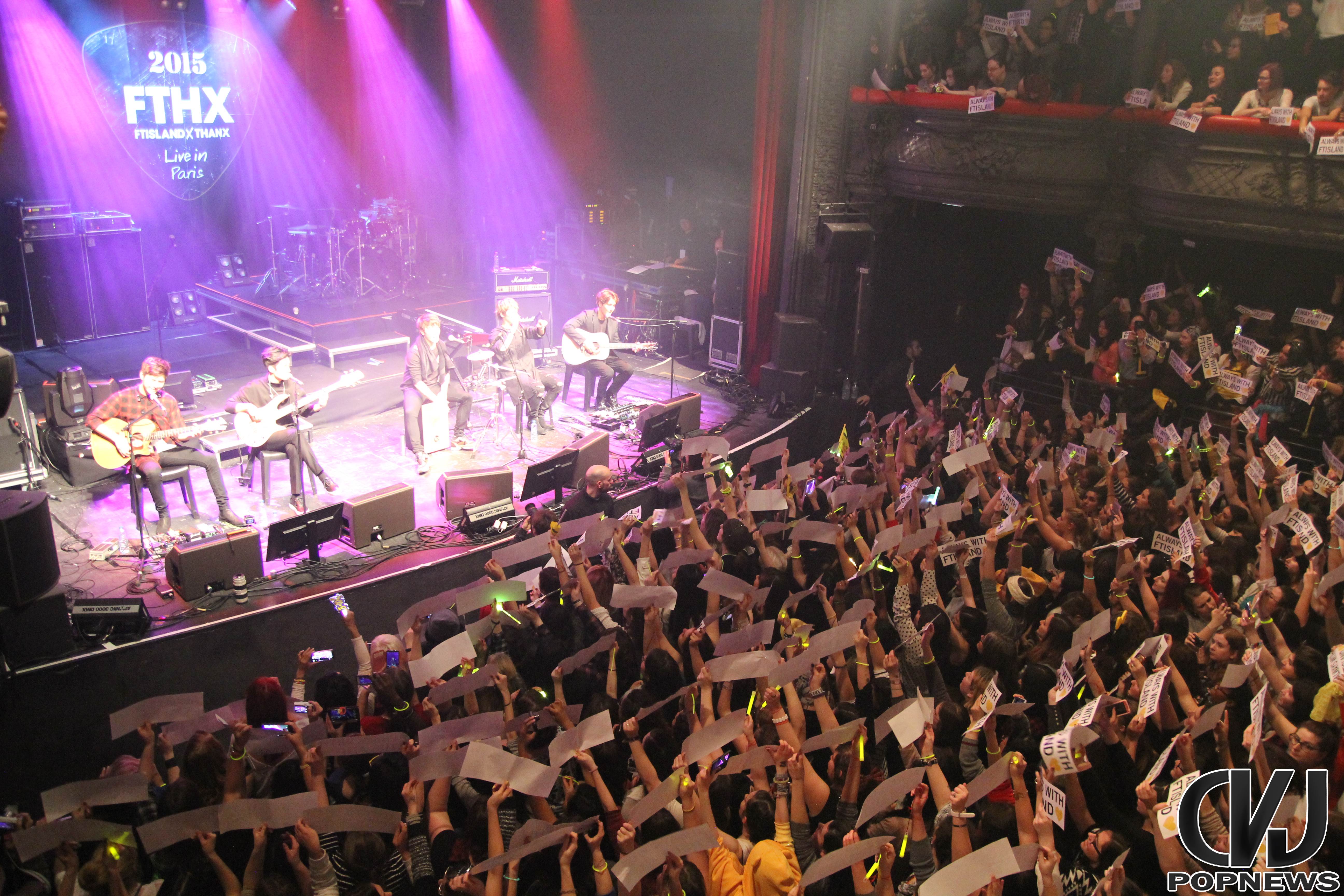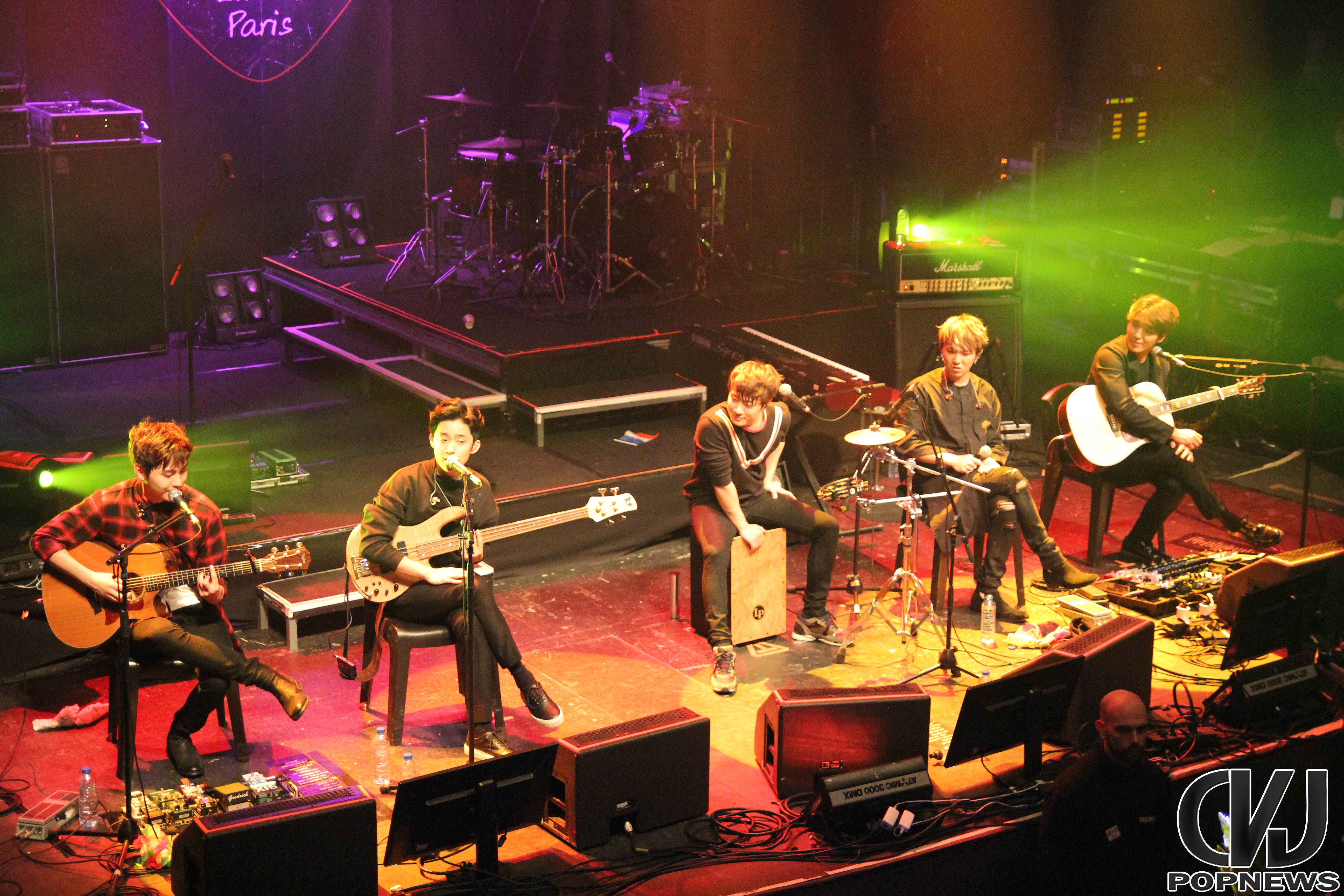La salle se remplie doucement, jusqu’à ne laisser aucune place de libre et à 19h30 pile les lumières s’éteignent, le public cri et Jonghoon entre en scène. Le concert débute sur une intro au piano jouée par le leader du groupe. Les membres arrivent un à un et entre le concert avec la chanson Last Love Song. Hongki, portant un petit drapeau aux couleurs de la France, enflamma instantanément la scène.