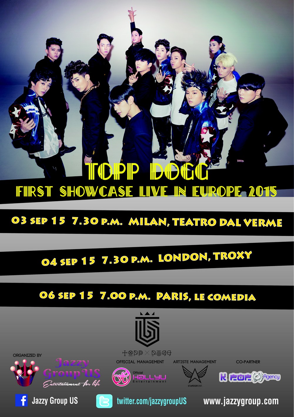 Le site internet Jazzy Group US, qui s’occupe des concerts à l’étranger du groupe coréen TOPP DOGG, vient d’annoncer que le groupe tiendra trois concerts en Europe à la rentrée et bonne nouvelle puisque le groupe devrait passer à LONDRES, à MILAN mais aussi à PARIS !