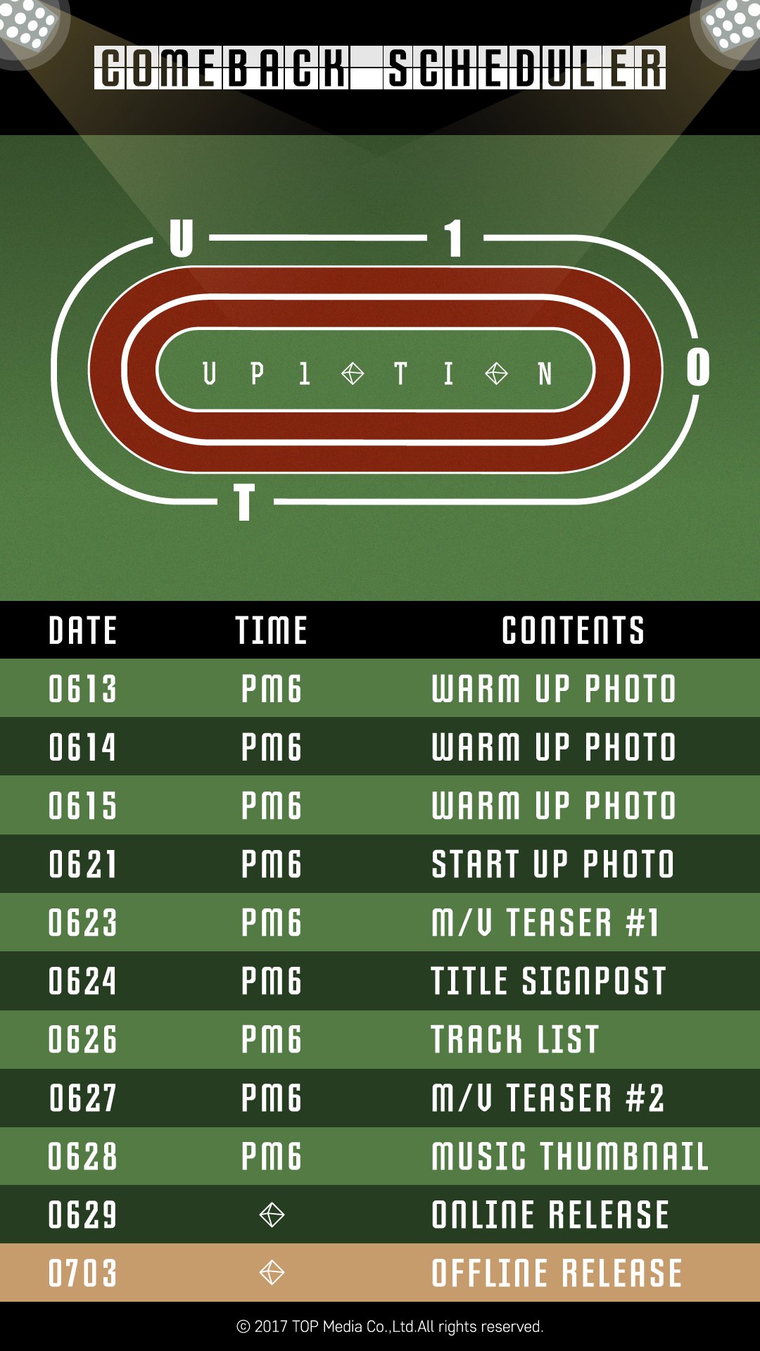 Le 12 juin, le groupe UP10TION a partagé un planning détaillant les dates importants de son retour. Comme vous pourrez le voir ci-dessous, le groupe fera son comeback le 29 juin avec un nouvel opus dont le thème semble centrer autour du sport :