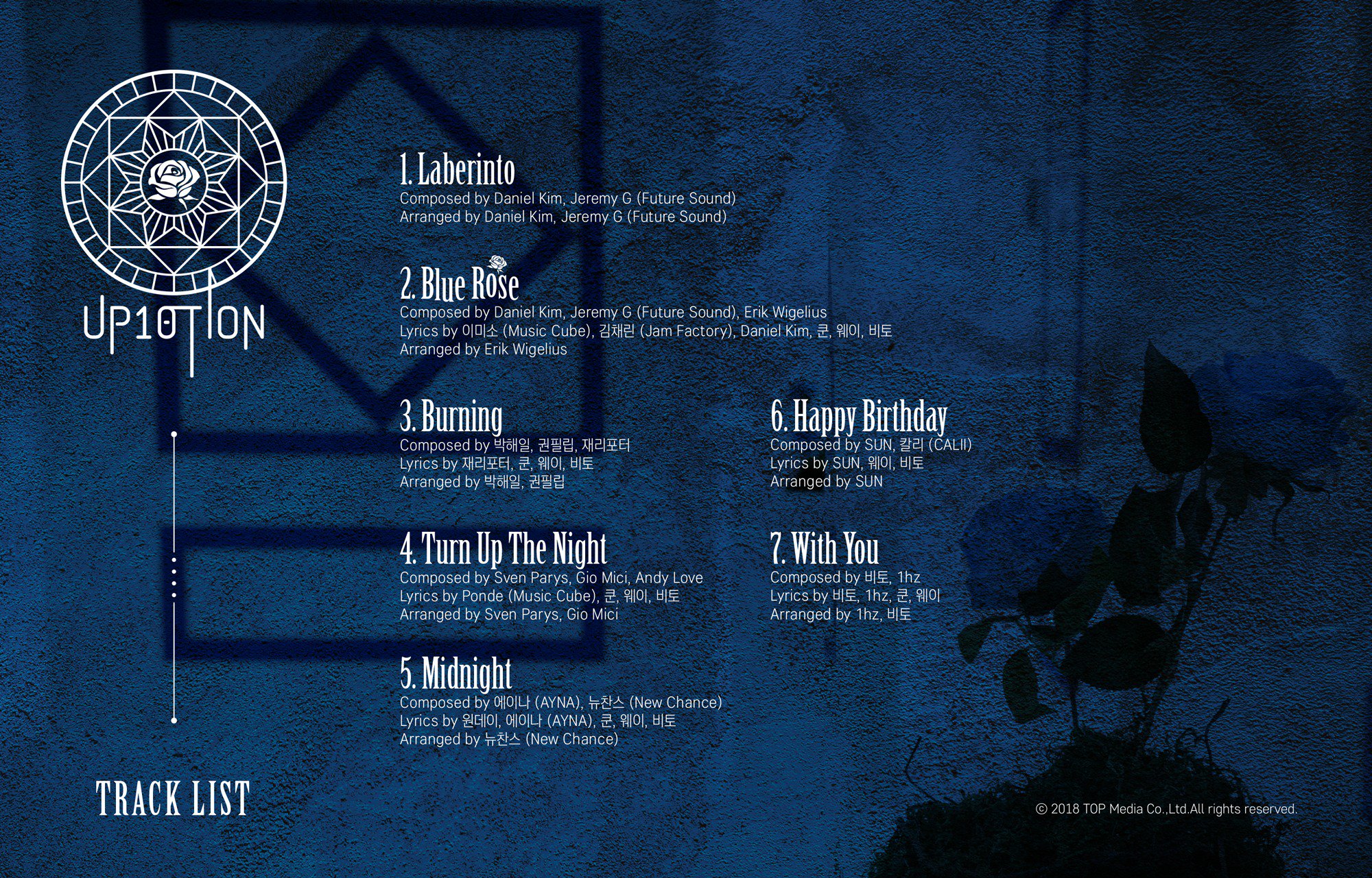 Ce 6 novembre UP10TION a sorti le MV de “Blue Rose“. On y voit les membres dans un univers policier alors qu’ils enquêtent sur une affaire liée à une mystérieuse rose bleue, le tout sur une musique très dynamique. “Blue Rose” est la chanson titre de leur album “Laberinto” (“Labyrinthe” en espagnol) qui est également sorti. Avec ce nouvel album le groupe adopte un concept sombre impliquant la résolution d’un mystère ou d’un crime. Deux versions sont disponibles : “Clue” et “Crime”.